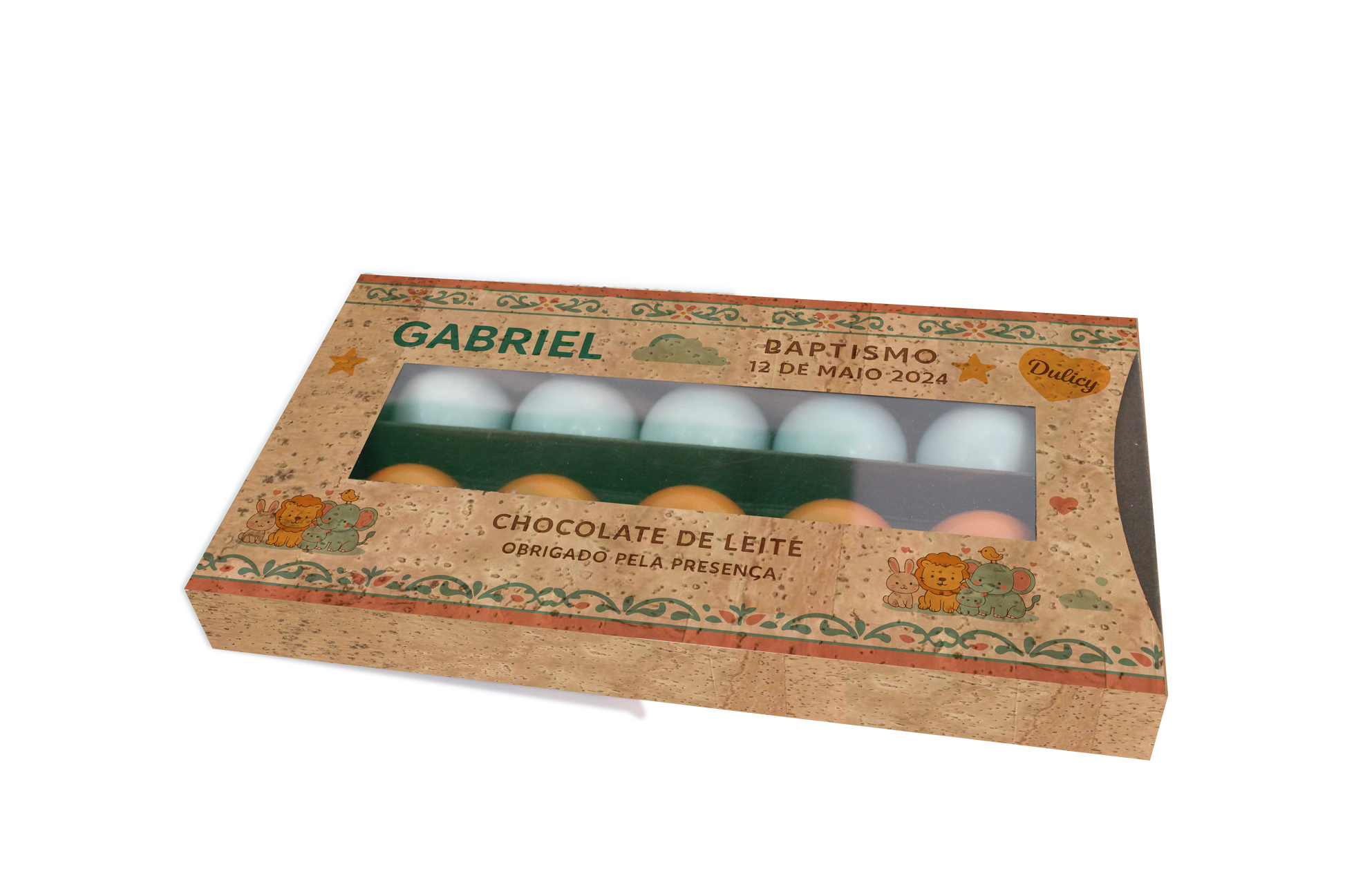 A embalagem é totalmente personalizável com o nome da criança, data do batizado e mensagens especiais — tornando-se numa lembrança única, deliciosa e visualmente encantadora.