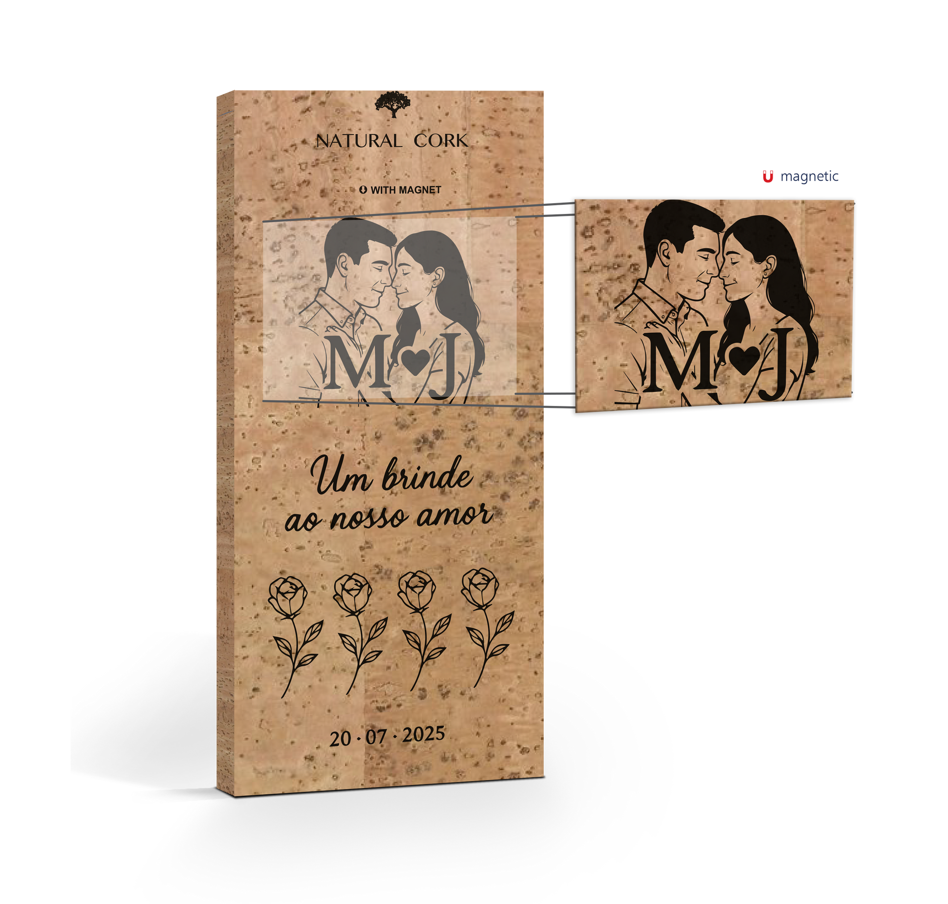 Surpreenda com criatividade e memória. Esta tablete de chocolate negro 55% cacau vem numa embalagem de cortiça personalizada e traz um íman removível com design exclusivo do seu evento.